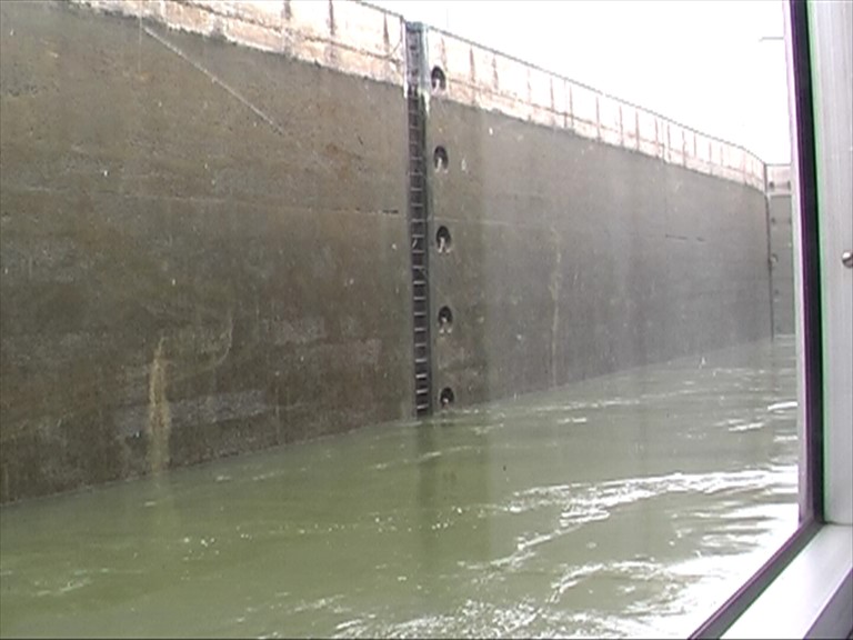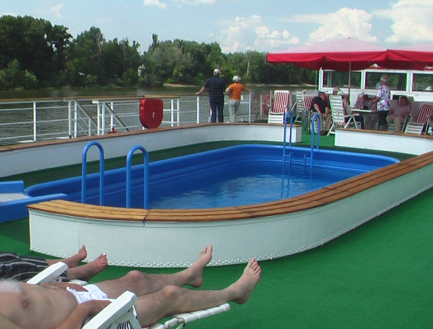 Man kann nur staunen wie Fotografen es hinbekommen die Zimmer und den Pool so groß zu fotografieren wie er im Prospekt ausgesehen hat. Mit der Wirklichkeit hatte das wenig zu tun. Es sind schon Künstler. War erst ein wenig enttäuscht ( war keine Fantasy in klein) Nach dem Begrüßungstrunk mit Kapitän und Gefolge, gab es unser erstes Abendessen. War toll muss das aber nicht jeden Abend haben. eine Woche dieses Essen und man kann uns von Bord rollen. An unserem Tisch sind zwei nette Damen aus Stuttgart, von denen wir leider nicht die E-Mail haben. Wir passen gut zusammen, haben viel gelacht und gequatscht. Die Nacht war der Horror, habe erst ab 1:00h geschlafen, das Schiff hat so gewackelt und mein Magen mit. Von Passau bis Wien gibt es 11 Schleusen die Größte gleicht einen Höhenunterschied von 20 Metern aus. Kommt nachts gut wenn das Flutlicht geschaltet wird.