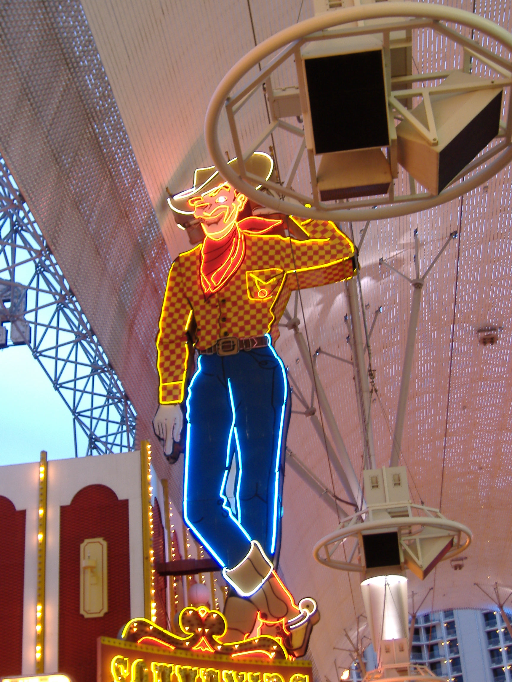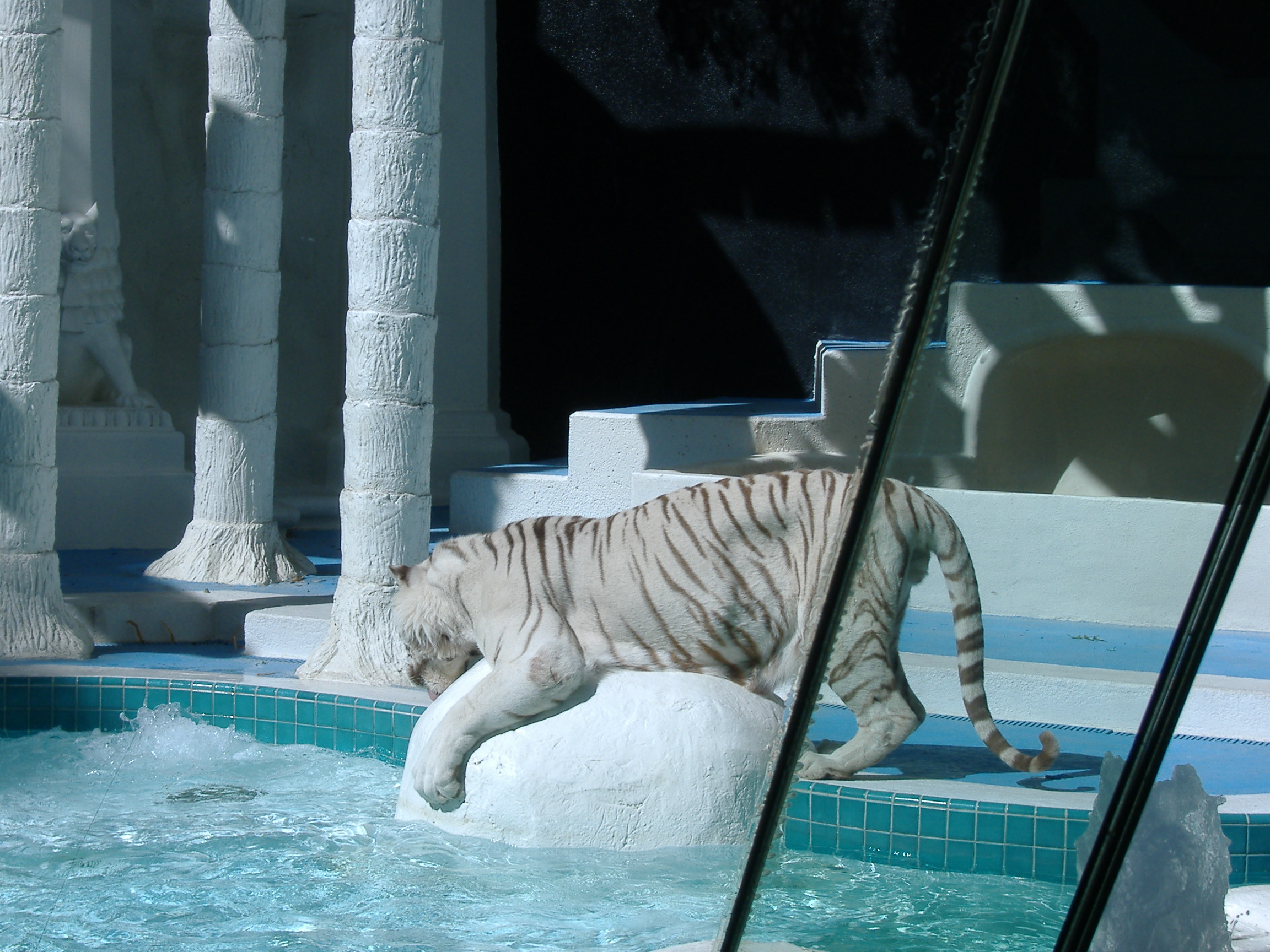 Ich durfte nur von weitem zusehen weil ich noch keine 21 Jahre bin. Heute den 05.04. 2006 haben wir richtig schön ausgeschlafen, bis halb acht, dann wurde ich unsanft aus dem Schlaf gerissen, weil Sascha angerufen hat. Aber wenn er es war stört es mich ja nicht... „grins“. So gegen acht sind wir dann frühstücken gegangen, ganz in Ruhe, die anderen aus unserer Gruppe sind heute zum Tal des Todes gefahren. Dem tiefsten Punkt der westlichen Hemisphäre. Dazu hatten Opa und ich aber keine Lust wir haben lieber noch einen ganzen Tag in der Spielermetropole genossen. Unser Hotel liegt genau am Las Vegas Strip. Hier fahren alle 10 Minuten Busse entweder zur Downtown oder zum anderen Ende des Strips. Wir sind erst mal zum anderen Ende gefahren und waren noch mal im Mirage. Dort haben wir den weißen Tiger gesehen mit dem Siegfried und Roy ihre Show gemacht haben. Total Süß! Danach sind wir ins Treasure Island gefahren, das ist so groß, das uns wir erstmal prompt verlaufen haben und auf irgendeiner Messe gelandet sind, aber noch im Hotel. Nach dem wir da wieder raus gefunden haben sind wir wieder mit dem Bus gefahren. Wir haben das Luxor gesucht, das ist das berühmte Hotel in Pyramidenform mit einem ganz hellen Lichtstrahl oben aus der Spitze. Wir sind in die völlig falsche Richtung gefahren und waren irgendwann in Downtown. Hier waren wir Spagetti essen um 12:15. Aber das war eher eine Spagettisuppe als richtige Spagetti und total süß das Zeug, echt eklig. Wir haben das Luxor ja nicht gefunden also sind wir zurück zum Hotel gefahren. Der Hammer war ja das es heute echt total kalt und windig war und es hat geregnet obwohl gar keine Wolken da waren, aber na ja das Wetter ist hier ja eh ein bisschen komisch.... Zurück