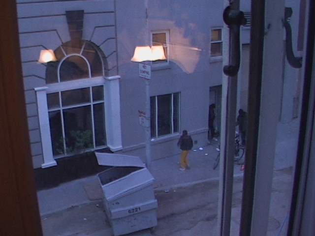 Fenster, was in eine Seitenstraße reicht, lungern am Tag 10 – 15 Obdachlose